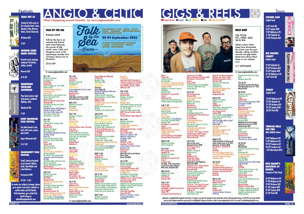 Advertisers in Anglo&Celtic magazine who book 1/4 page or over get free listings for that month plus electronic links to their website or a ticket purchase link. Paid individual gig guide listings, at $20+GST, get venue details and an electronic link. Regular advertisers get priority for highlighted listings and features. Book here at our website or by email to editor@angloandceltic.com
