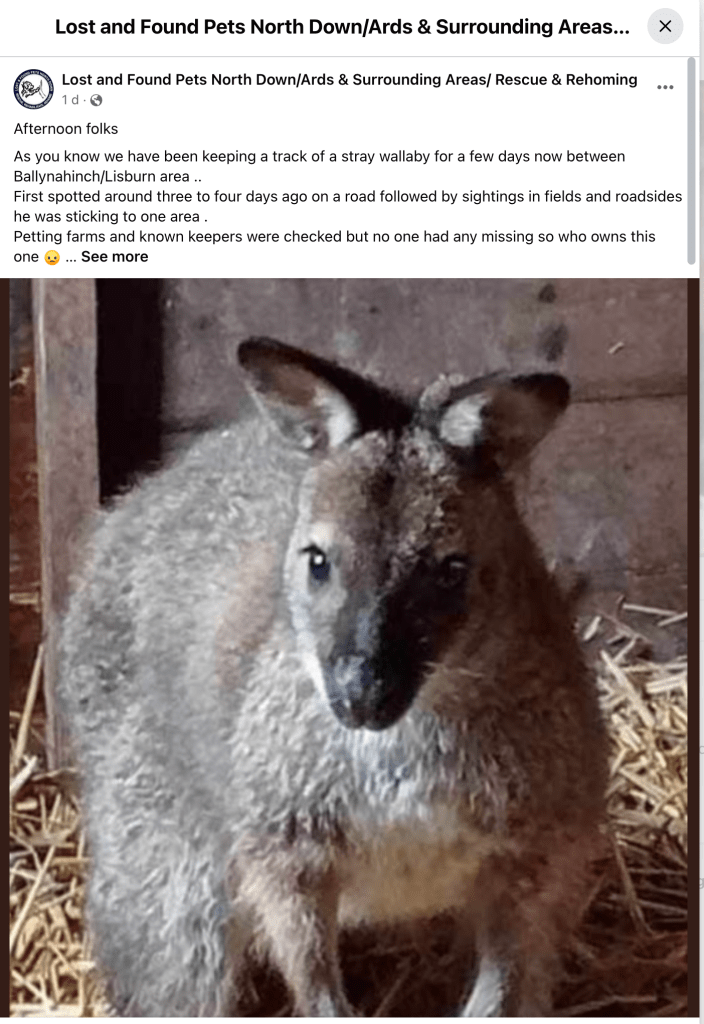“After days of tracking a stray wallaby in the Ballynahinch/Lisburn area, we are pleased to inform everyone that the animal is now in experienced hands,” the group wrote.