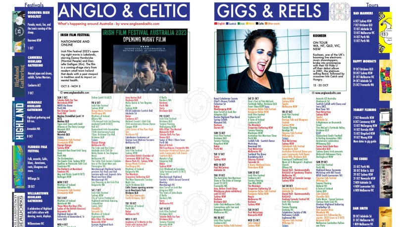 Advertisers in Anglo&Celtic magazine who book 1/4 page or over get free listings for that month plus electronic links to their website or a ticket purchase link (from our pdf files). Paid individual gig guide listings, at $20+GST, get venue details and an electronic link. Regular advertisers get priority for highlighted listings and features. Book here at our website or by email to editor@angloandceltic.com