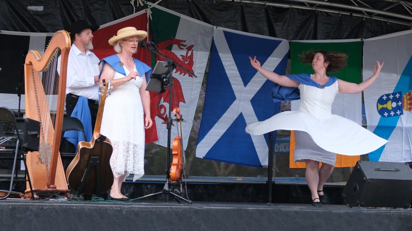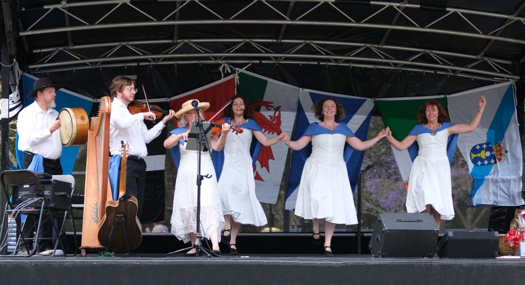 “The performance repertoire of the Manx Dancers of Brisbane includes the Ladies Jig, Dance of the Yellow Flowers, Return the Blow, and the Dance for Three. We have two performance costumes: one represents the colours of the Manx flag – a red shirt and black skirt or trousers; the other costume is a white dress with a Laxey blue shawl and Celtic brooch, our men wear a white shirt, black trousers, and blue sash. Blue is the dominant colour in the Manx tartan, misty blue for the seas that surround the island. We have performed for the Manx Society in Brisbane, and recently at the unveiling of the Celtic Council’s Standing Stones in Moorlands Park. We hope to perform at the Glen Innes Celtic Festival in 2024 where the Isle of Man is one of the featured nations.”