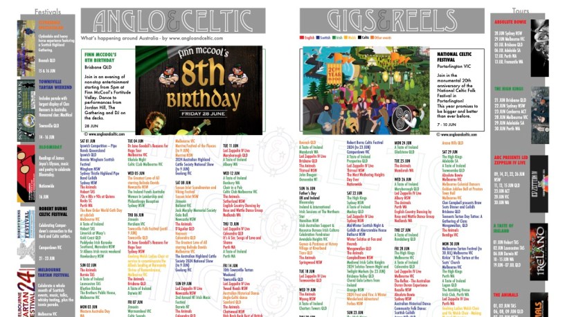 The gig guides are a great way to advertise your upcoming events with us on a budget. Email us for details, editor@angloandceltic.com, or see our press pack on this website.