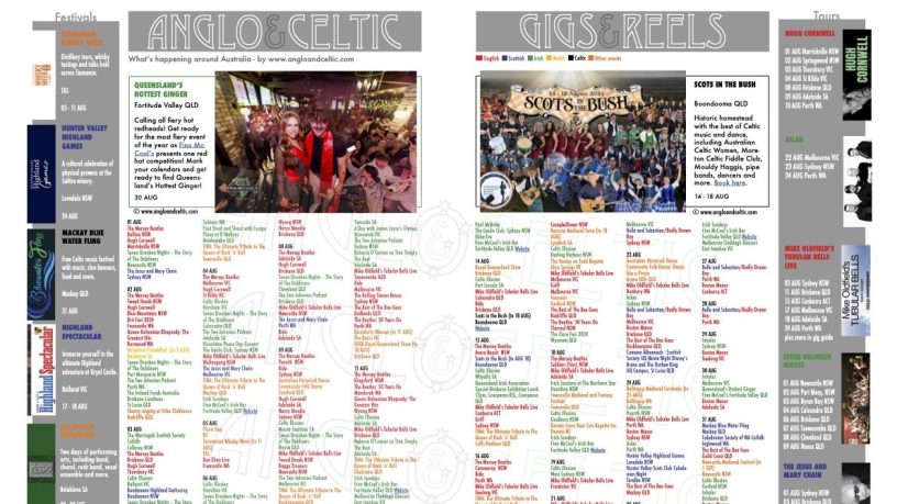The gig guides are a great way to advertise your upcoming events with us on a budget. Email us for details, editor@angloandceltic.com, or see our press pack on this website.
