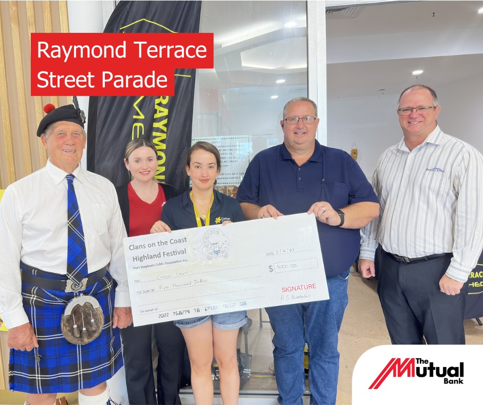 Main picture: $5,000 from the proceeds of the 2023 Clans on the Coast festival was donated to the Cancer Council. Pictured are festival president Ron Swan, Sharon from festival sponsors The Mutual Bank, Daneille from the Cancer Council, festival vice president Adam Nicholas and Jason from the Raymond Terrace Bowling Club. Credit: Facebook.com/TheMutualBank