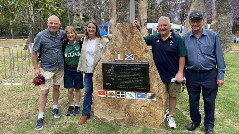 Pictures: Celebrations at the inauguration of the Celtic Nations Monument in Moorlands Park in 2023, and representatives of the Irish communities in Brisbane and Perth at the monument. Credit: Anglo&Celtic