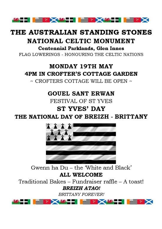 In Australia, the main event for 2025 will take place in Glen Innes, New South Wales, home of the Australian Standing Stones. The local Standing Stones Management Board will once again hold a flag lowering ceremony, paying tribute to Saint Yves with a talk, a toast, and a taste of traditional Breton food. The event is free and open to all who wish to celebrate Brittany’s Celtic heritage.
